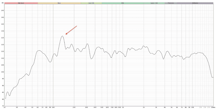 La siguiente medición la realice yo mismo en un control de monitoreo, y muestra claramente entre otras cosas, un exceso de energía en torno a los 125 ciclos, que seguramente es una resultante de la interacción de las dimensiones de la sala y longitudes de onda relativas a la misma.