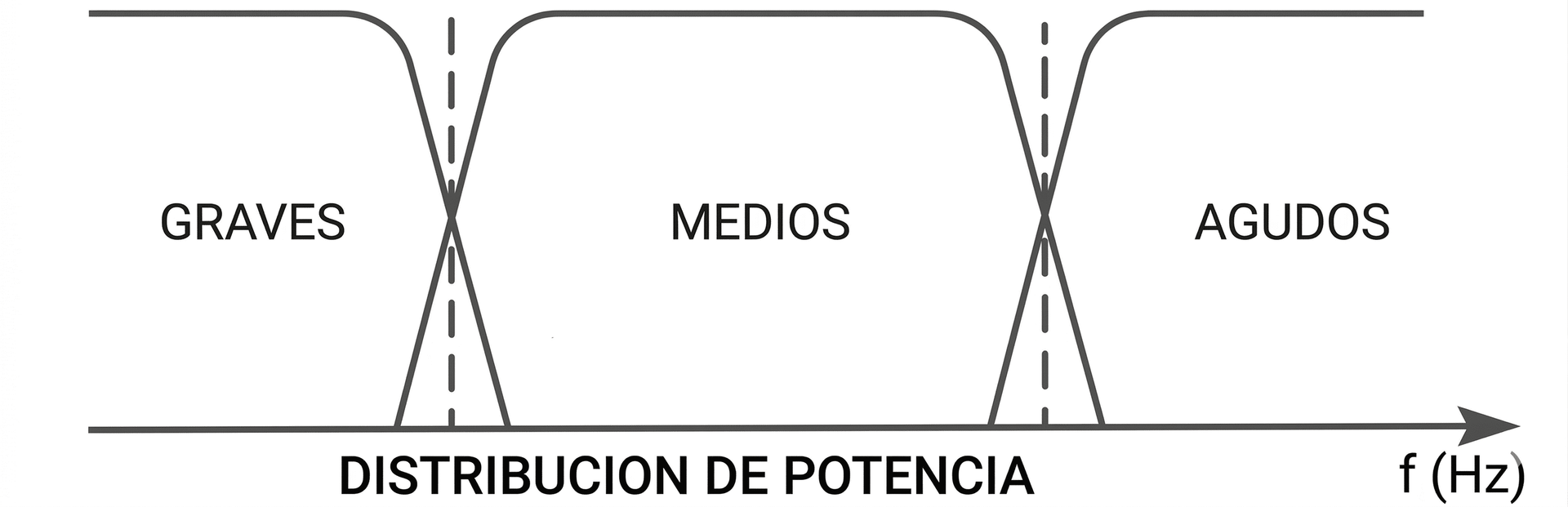 Sin embargo, esta sencilla división tonal contiene información que no se observa a simple vista… dado que si contamos con 3 macros tonales, en dicha configuración existen 2 puntos de cruce, es decir, la transición de los graves hacia los medios y de los medios hacia los agudos.